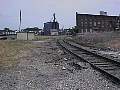 Now we're looking south from essentially the same location. Here you see the tracks entering the street, and heading south. Philadelphia Street crosses at the intersection. The building on the left was originally a steam plant that generated electricity, and sold the steam to downtown buildings for heat. It has since been converted into a commercial/industrial complex with different businesses, including a switching station for MCI. Sadly, no one in the complex is using any rail service.